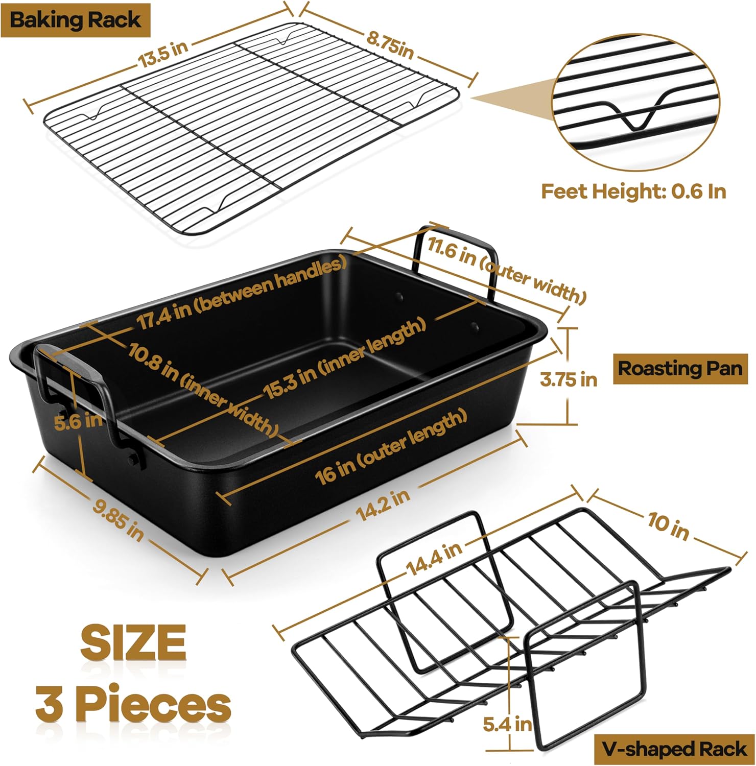 P&P CHEF 16" Roaster Roasting Pan with Baking Rack and V-shaped Rack, Stainless Steel Rectangular Lasagna Pan with Handles for Turkey Chicken, Healthy & Dishwasher Safe, 3 Pieces, Black