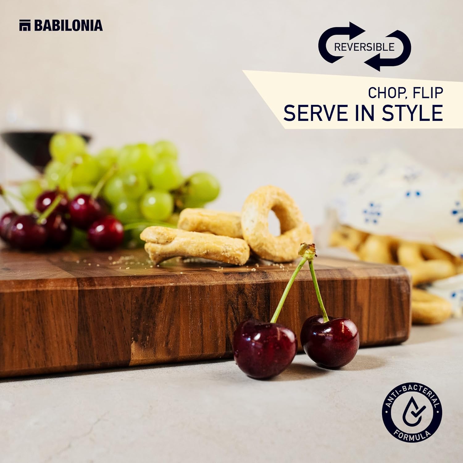 - SIMPLE & SOPHISTICATED DESIGN : Presenting our exclusive 3 in 1, butcher block / wood cutting board / serving board tray. Babilonia create an innovative design. In fact, you can use the notch and the plate to slide your chopped produce onto your pot or bowl. You will no longer need anymore to lift your cutting board for an onion. It will help to cook with pleasure and more ease. A beautiful product which will last you. It is also reversible to use as a serving tray (Hidden handle).