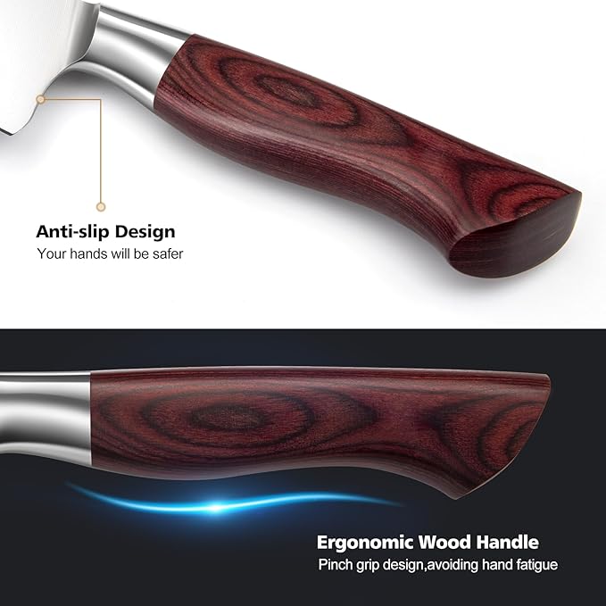 - 【Superior Design & Easy Maintain】Kitchen knife set blade is treated with a sandblasted process, Improve the texture of the knife surface, not easy to adhere to food residue. Knives set is well organized in wood knife block, ventilation design at the bottom keep tidy and space-saving.
