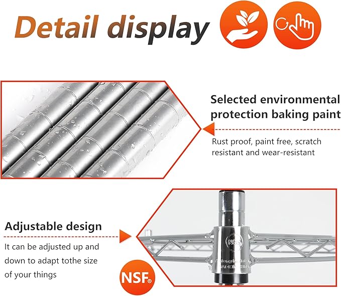 - 3.**Feet Levelers for Stability on Uneven Ground:** The included feet levelers ensure that the shelves remain stable even on uneven surfaces. No more wobbling or tilting, this wire shelving provides a secure storage solution for all your essentials. Keep your items safe and balanced regardless of the flooring in your space with this storage shelves.