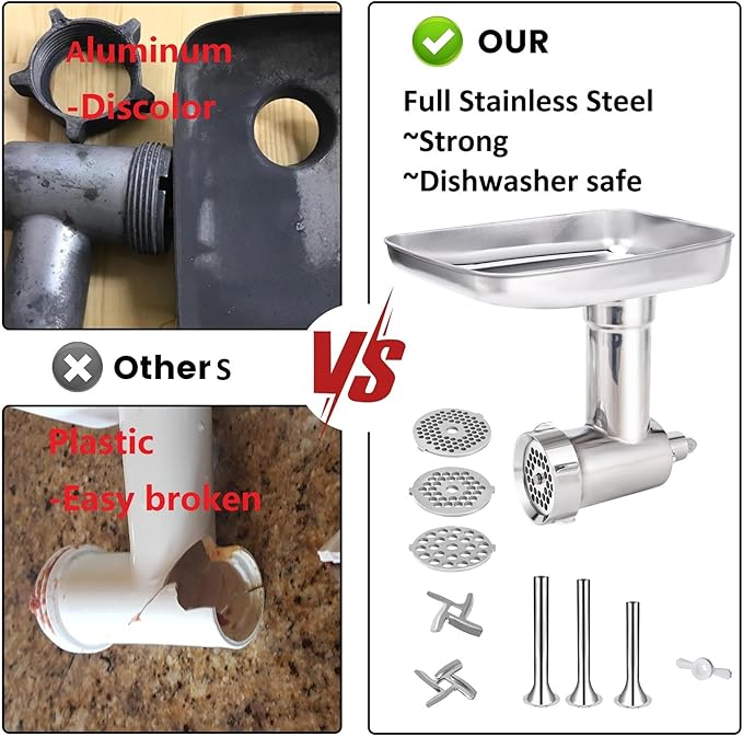 - [ ๐ฆ๐๐ฎ๐ถ๐ป๐น๐ฒ๐๐ ๐ฆ๐๐ฒ๐ฒ๐น & ๐๐ถ๐๐ต๐๐ฎ๐๐ต๐ฒ๐ฟ ๐ฆ๐ฎ๐ณ๐ฒ ] Meat grinder attachments are made of sturdy stainless steel, durable, mirror polishing surface for easy cleaning, top rack dishwasher safe! No worry about those troubles of Aluminum discoloring or Plastic cracking. ( Food pusher is plastic and also dishwasher safe) Easy Washing!