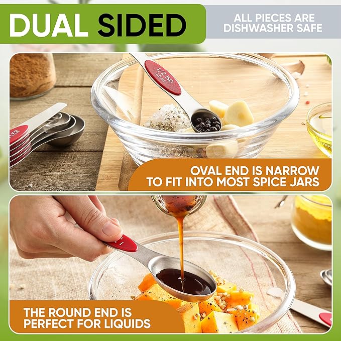 - Dual Sided Spoons and Cups With Pour Spout: Oval end is narrow to fit into most spice jars. The round end is perfect for liquids. The spoons also lay flat on the counter without spilling their contents. Cups have a pour spout for liquids. All pieces are dishwasher safe.