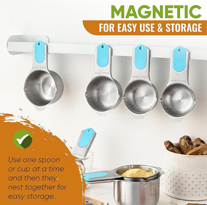 - Patent Pending Magnetic Design For Easy Use And Storage - These magnetic cups and spoons let you use one spoon or cup at a time and then they nest together for easy storage. Quickly grab the spoon or cup you need without having to fumble with opening and closing a ring. They even have U.S. and metric measurement markings that are easy to read and won't fade or rub off.