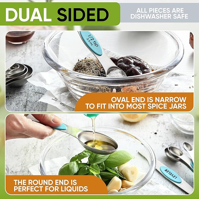 - Dual Sided Spoons and Cups With Pour Spout: Oval end is narrow to fit into most spice jars. The round end is perfect for liquids. The spoons also lay flat on the counter without spilling their contents. Cups have a pour spout for liquids. All pieces are dishwasher safe.