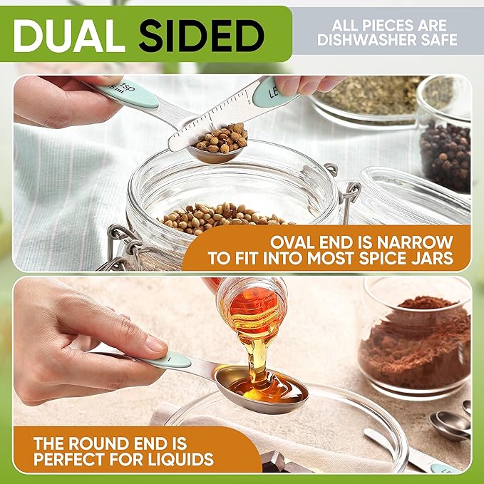 - Dual Sided Spoons and Cups With Pour Spout: Oval end is narrow to fit into most spice jars. The round end is perfect for liquids. The spoons also lay flat on the counter without spilling their contents. Cups have a pour spout for liquids. All pieces are dishwasher safe.