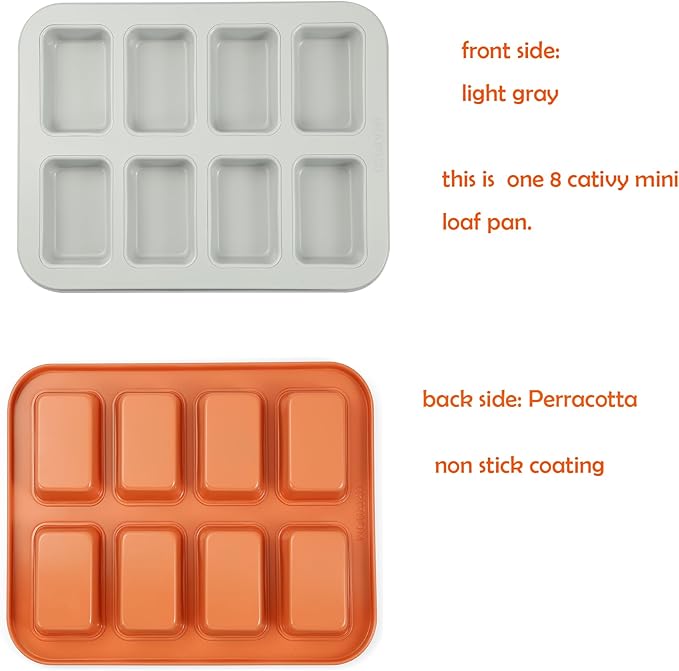 - SPECIAL COLOR DESIGN - Our 8 cavity mini loaf pans come with a light gray smooth non-stick coating so you can easily release your treats when they're done baking. And the bottom of the mini loaf bread baking pan is perracotta. The colorful design of the rectangle small cake tray can add more delight for your kitchen.