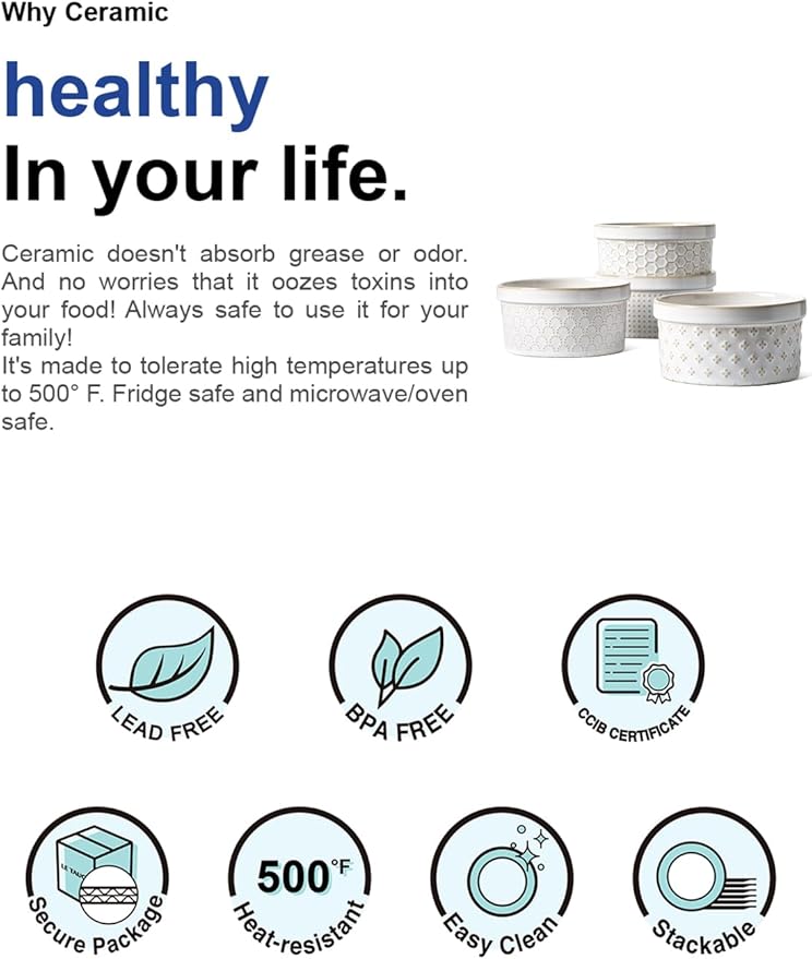 - Premium Ceramic Material:High-temperature fired ceramic ramekin, no lead and no cadmium, can withstand temperatures from -4°F to 482°F. Microwave, oven, and freezer safe, so they can move easily from the oven to the freezer to your dining table