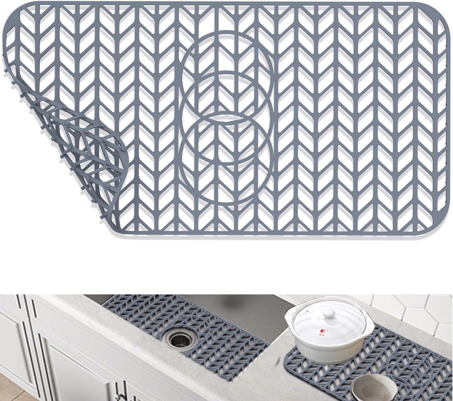- 【Silicone Material】 Silicone Unlike metal sink mats, silicone sink protectors are super non-slip, preventing spoons and other silverware from scratching the sink, silicone sink mats prevent dishes from slipping down the drain, protecting your sink from clogging, silicone sink mats are suitable for most drain openings.