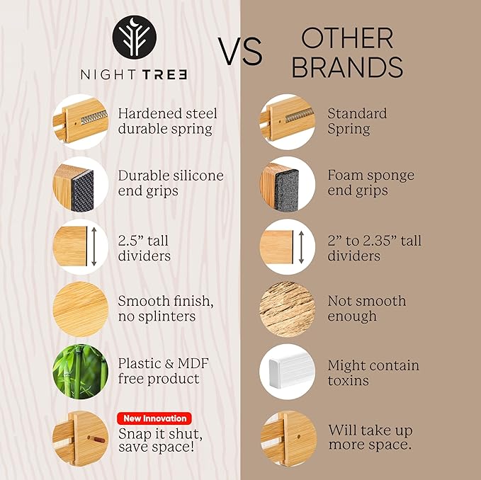 - Optimize Your Storage: Transform any cluttered drawer with NIGHT TREE's bamboo drawer dividers. These drawer organizer clothes solutions are expandable and crafted from robust bamboo, ensuring your items are neatly separated and easy to find.