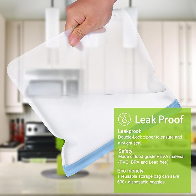 - Freezer Safe & Dishwasher Safe: The freezer bags can lock out freezer burn while keeping food fresh and full of taste, perfect for freezing meat, chicken, fish, fruits and vegetable. Upgraded PEVA material that is dishwasher safe. however, please skip high-temperature functions such as the dishwasher's drying to extend the lifespan of the bag. We suggest alternating hand wash and air dry to clean for long-term usage. Not microwave friendly.