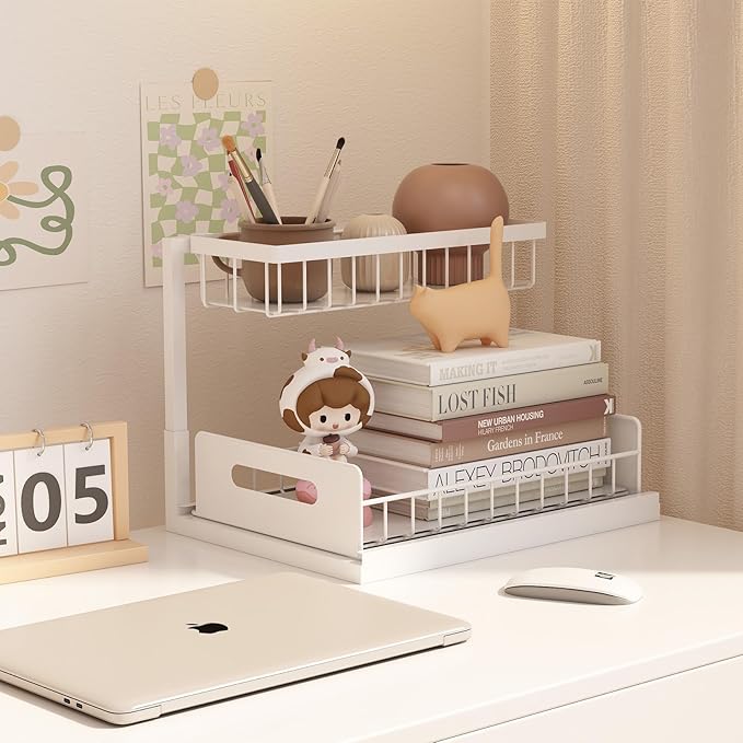- [Space Saving] Organize the space under your cabinets with this 2-tier under sink storage. This under the sink organizer can solve your under cabinet storage troubles and increase the utilization of limited sink space. With pull out cabinet organizer, you have room for all your stuff, and a slide-out system like this makes it easier to access everything you store under the sink