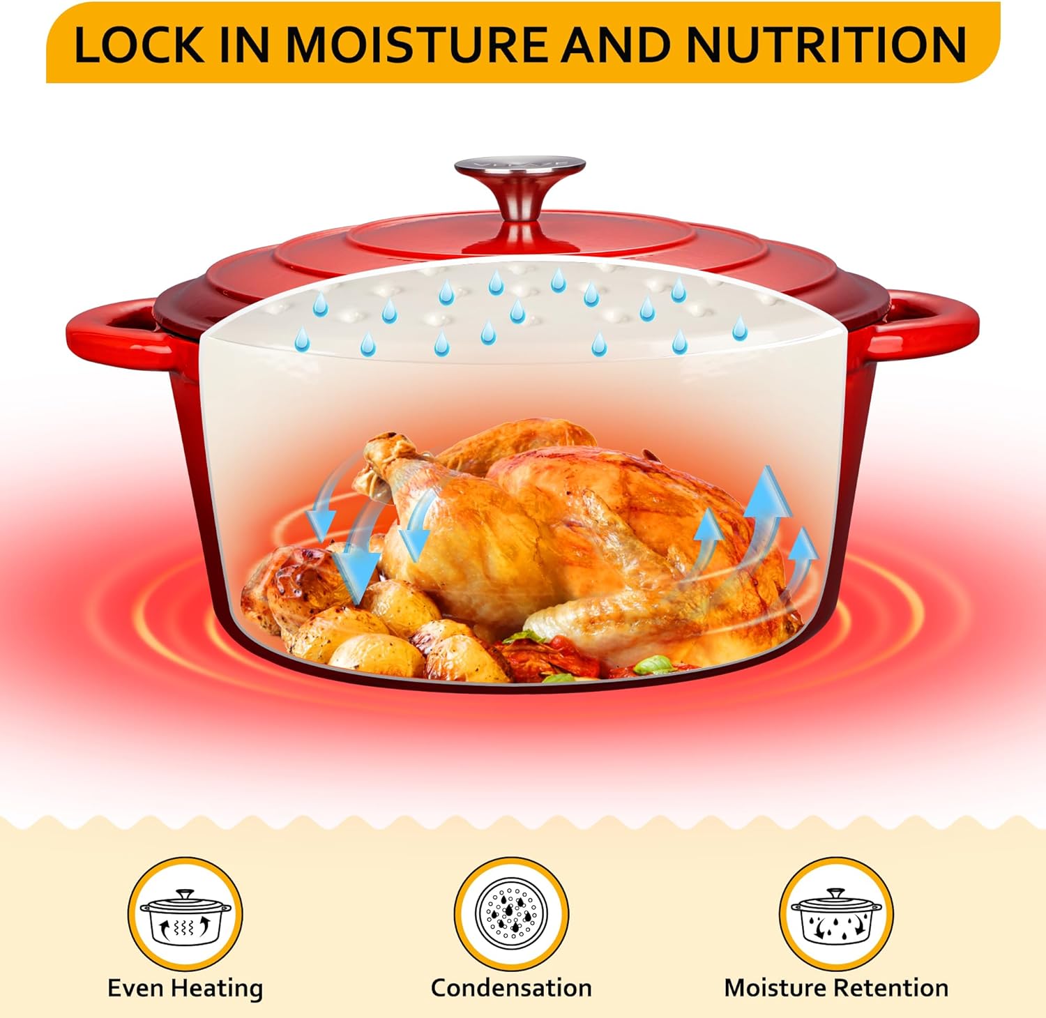- 【INTERNAL CIRCULATION DESIGN】 This enameled dutch oven pot is design with circulating shower type lid, the raised design of the pot cover allows the water vapor circulates and locks inside the dutch oven, fully releasing the flavor and nutrients of the ingredients, possess pretty heat retention performance.
