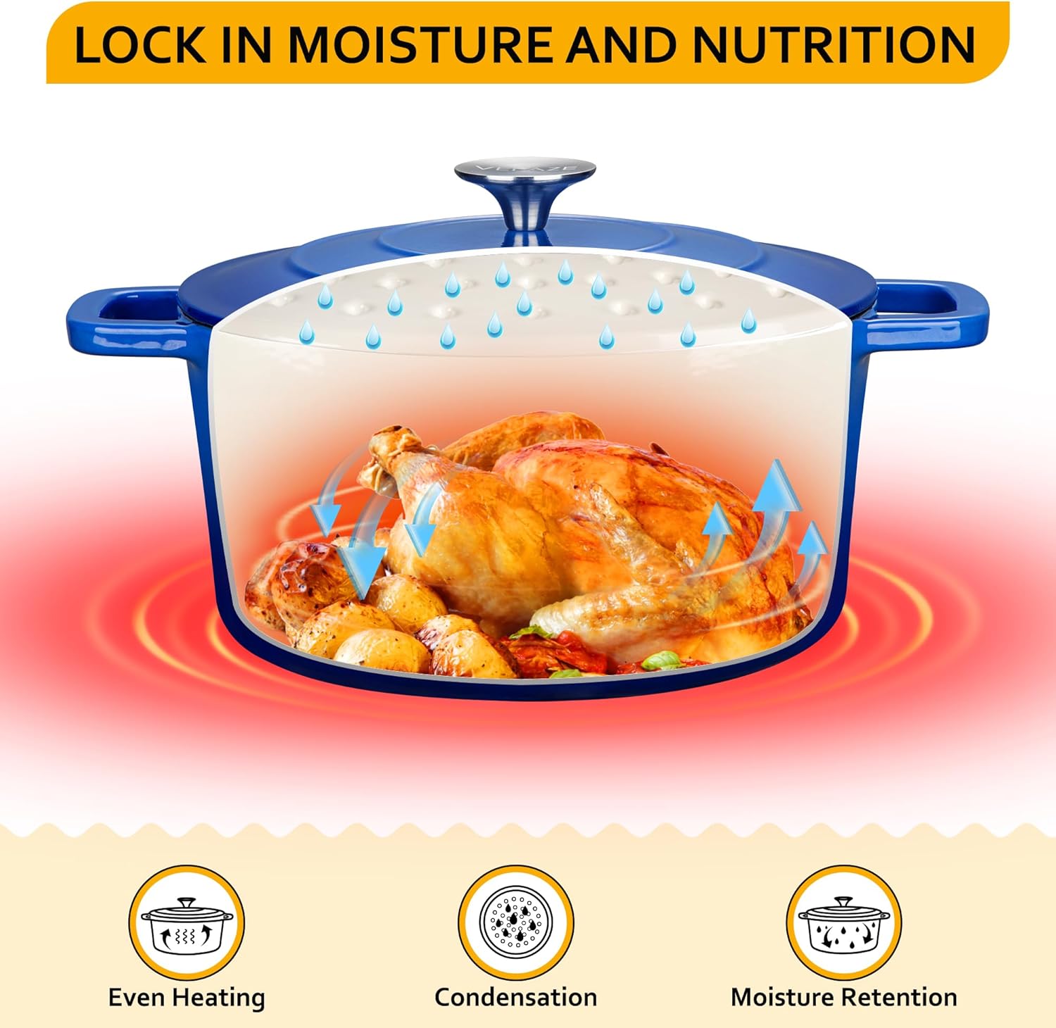 - 【INTERNAL CIRCULATION DESIGN】 This 6-quart Dutch oven cast iron is design with circulating shower type lid, the raised design of the pot cover allows the water vapor circulates and locks inside the dutch oven, fully releasing the flavor and nutrients of the ingredients, possess pretty heat retention performance.
