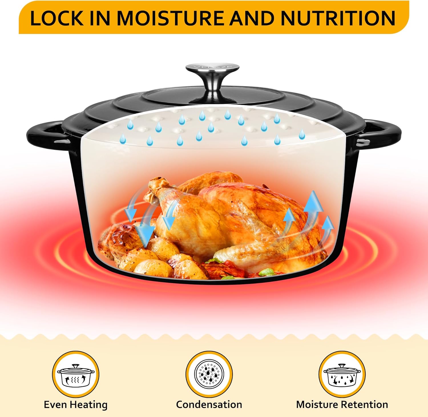 - 【INTERNAL CIRCULATION DESIGN】 This enameled dutch oven pot is designed with a circulating shower-type lid. The raised design of the pot cover allows the water vapor to circulate and lock inside the dutch oven, fully releasing the flavor and nutrients of the ingredients. It possesses excellent heat retention performance.