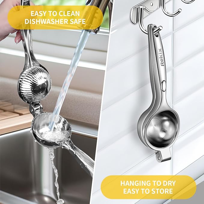 - EASY TO USE AND CLEANING IS A SNAP: Simplicity meets sophistication with Rekix's Lemon Squeezer. Effortlessly wield the power of this culinary tool, making juicing a breeze for anyone. When the citrusy magic is done, cleaning is a snap. Whether tossing it in the dishwasher or rinseing it under the tap, Rekix makes cleanup as easy as enjoying fresh-squeezed juice.
