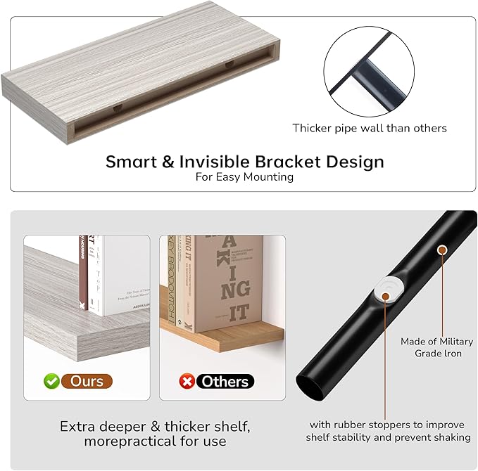 - Extra Deeper & Thicker - Each board measures 16"W x 6.7"D x 1.4"H. Extra deeper and thicker design in order to bring maximizes storage space and weight capacity, even hold up to 30 lb each. This floating shelf taking up zero square feet, reduces clutter and highlights décor in compact spaces.