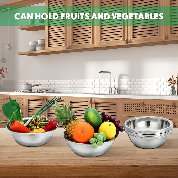 - Rolled Edge and Flat Bottom Design: the stainless steel prep bowls adopt rolled edge design, easy to hold; The flat bottom design makes them stable on the table and also allows for smooth placement while mixing; Metal mixing bowl can be nested storage, saving space