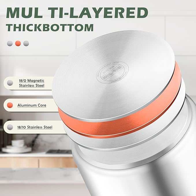 - Fast and Even Heating Design, with a pure aluminum core layer sandwiched between two layers of stainless steel, our triple-layer disc based large pot effectively reduces the risk of warping and ensures optimal thermal transmission to cook faster and save more energy