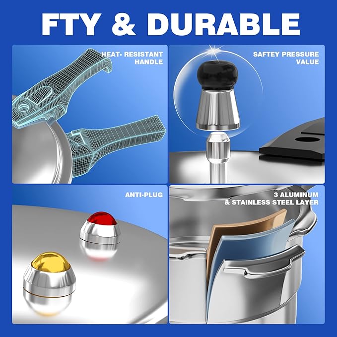 - MULTIPLE SAFEGUARD DEVICES: The WantJoin aluminum pressure cooker features 8 safety features, acting as a fully armed bodyguard for your cooking. It includes a self-locking valve, limit valve, anti-blocking lid, safety valve, pressure release window, and more. Cook with peace of mind!