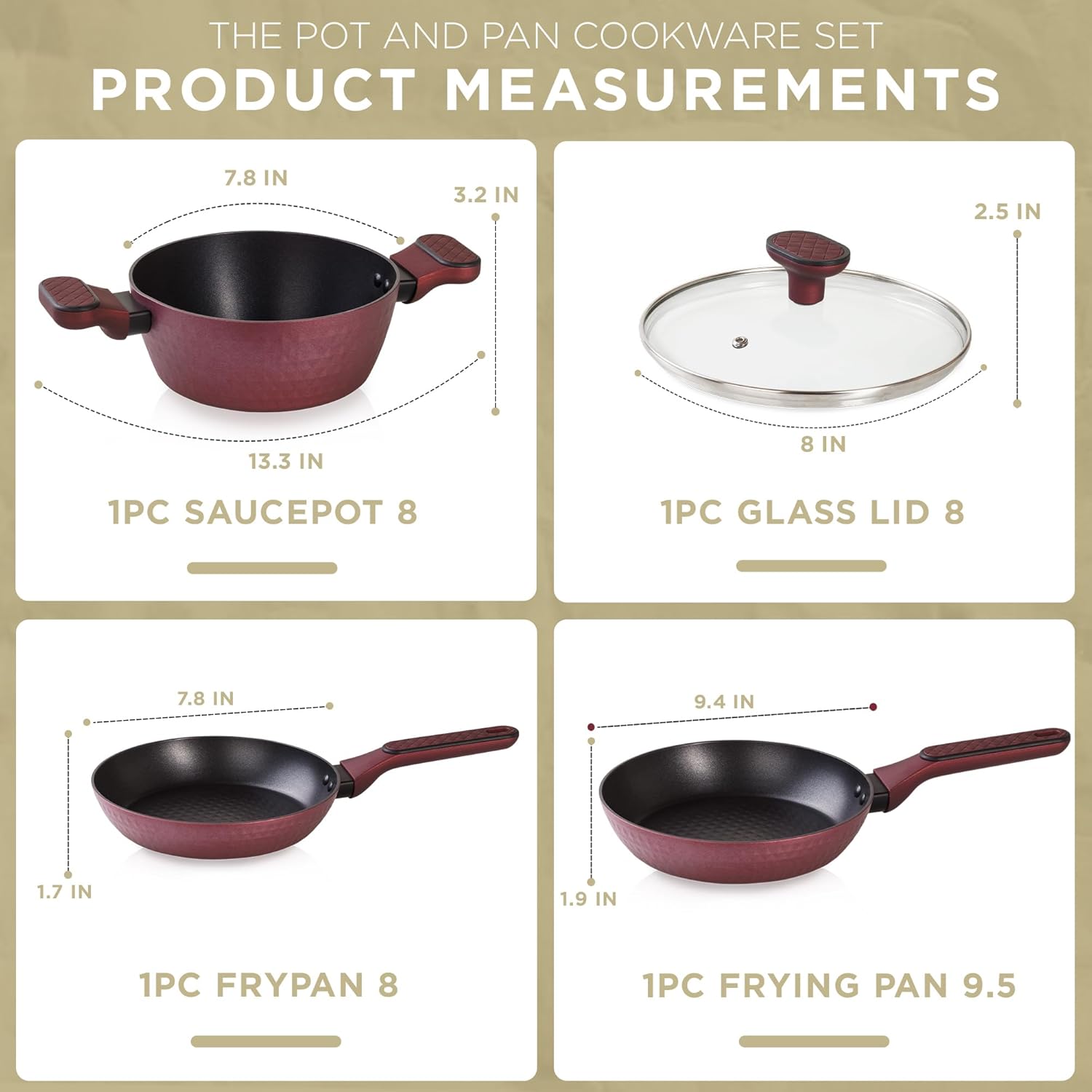 - Size : 1 saucepot 8", 1 frypan 8", 1 frying pan 9.5"