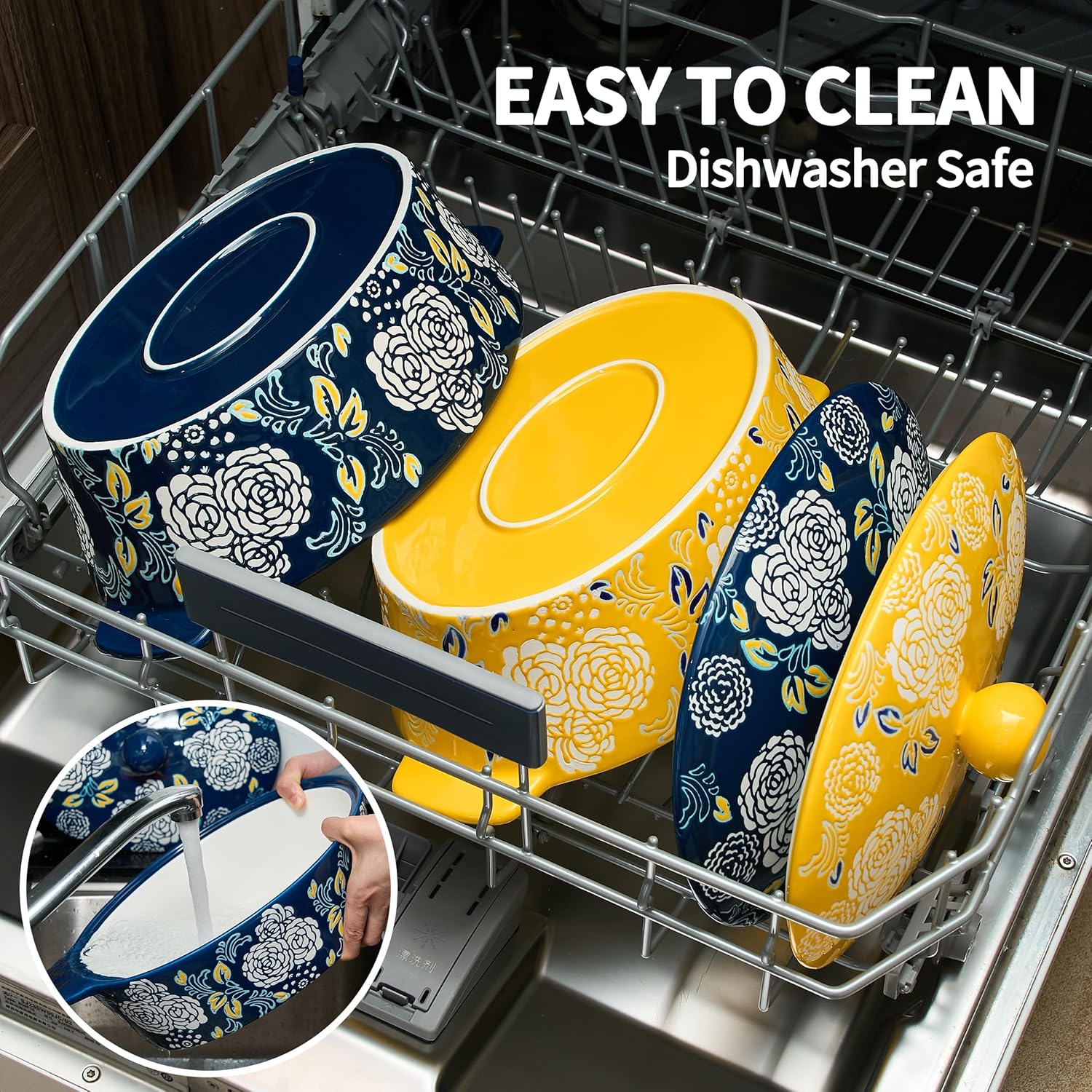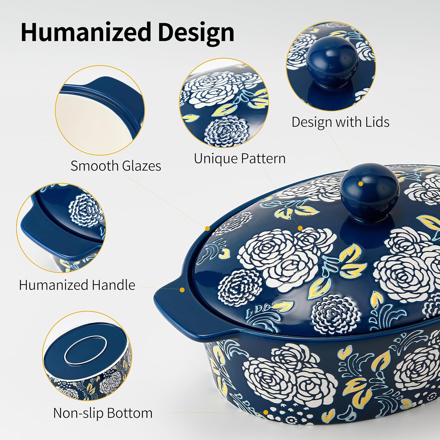 - ๐๐ง๐ข๐ช๐ฎ๐ ๐๐๐ฌ๐ข๐ ๐ง: The Casserole Dish Set with Lids features beautiful pattern design and popular color for easy daily use. Hand painted flower pattern can be a charming decoration in your table and kitchen. It will be an excellent server for your table.