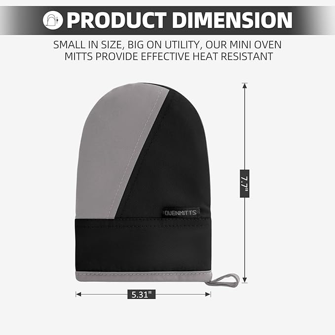 - 1 PAIR MINI SIZE OVEN MITTS: The size of the oven mitts is 7.7x5.3 in(L x W). A simple and practical design can fit the palm better. The mini design makes kitchen mittens take off and wear more conveniently.