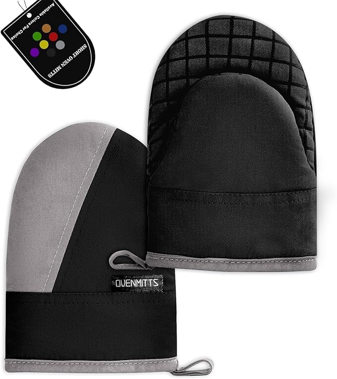 Mini Oven Mitts, Kitchen Oven Gloves Kitchen Mittens 500 Degrees Heat Resistant Baking Gloves, Non-Slip Silicone Surface with Hanging Loops Hot Gloves for Cooking, Baking, BBQ 1 Pair-Black
