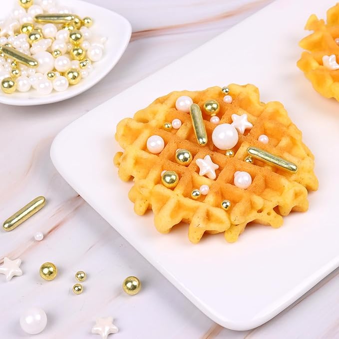 - Pearl Sprinkles: Each bottle weighs 4.23 oz, 120 g. Our white & gold sprinkles are made from safe ingredients, Nut Free. Our cake sprinkles are in different shapes of Star and Pearl Sprinkles.