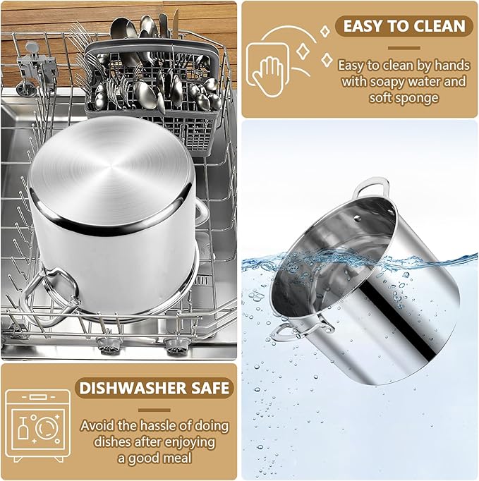 - 【MAKE CLEANING A BREEZE】Both brushed surface interior and mirror finished surface exterior can reduce the risk of food sticking and provide a smooth touching, 3-ply Bases get rids of burning of the food, The pot and lid have smooth edges with no sharp place and no dead corner, Will not hurt your hands and not hide dirt when using and cleaning, Easy to clean by hand, And dishwasher safe to keep away from the hassle of doing dishes, Free your hands and saving your labor and time when you are busy