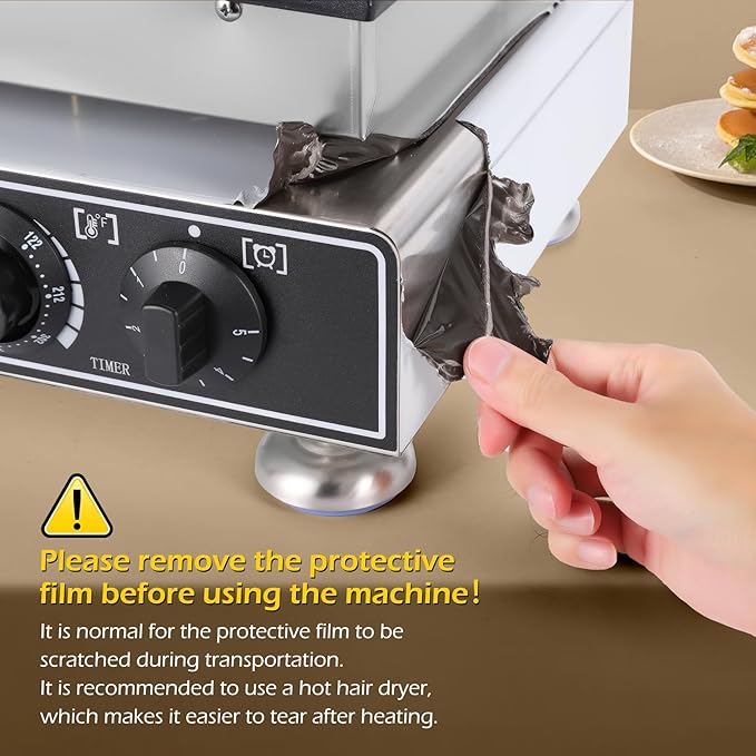 - 50PCS Commercial Dutch Pancake Maker- 1600W mini dutch pancake maker can bake 50pcs mini pancakes(1.57'') in 3-5 minutes, which is easy to operate and with non-stick coating, easy to clean. The mini pancake maker package included 1 * Egg Beater, 1 * Food Clip, 1 * Silicone Oil Brush, 1* Silicone Spatula, and 4 * Scouring Pads. (NOTE: Please Rip the Protective Film on the Surface Before Using the Machine)