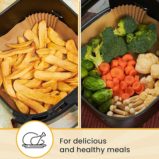 - HASSLE-FREE COOKING: Tired of curling parchment paper in your air fryer? Our precut, unbleached air fryer paper liner ensures your recipes come out perfectly every time! This air fryer liner is a time-saver.