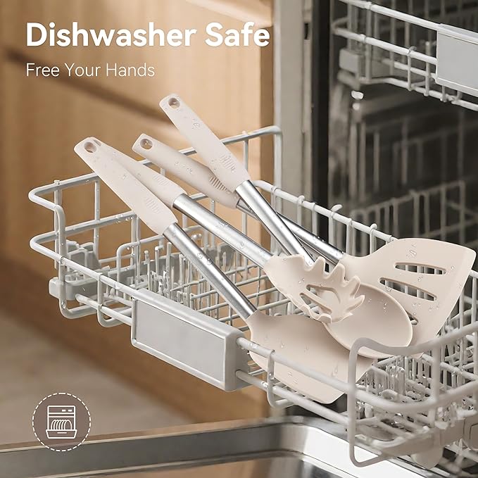 - SEAMLESS & DISHWASHER SAFE: The strong seamless welded design is a big plus, this kitchen utensil set has no seams to catch food or hide anything and is super easy to clean. Simply put them in the dishwasher after use and you'll have a new set
