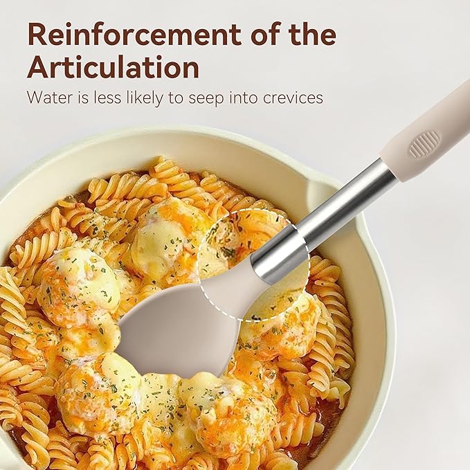 - LARGE STAINLESS STEEL HANDLES KITCHEN UTENSILS: Our kitchen utensils are designed in large sizes, not those ordinary kitchen utensils that look like toys. Silicone heads combined with high quality stainless steel handles ensure lightweight and durable. The thickened anti-scald silicone cover on the handle prevents slipping and also prevents the cook's hand from getting burned. Strong welding makes the silicone head durable and hard to come off even after long time use
