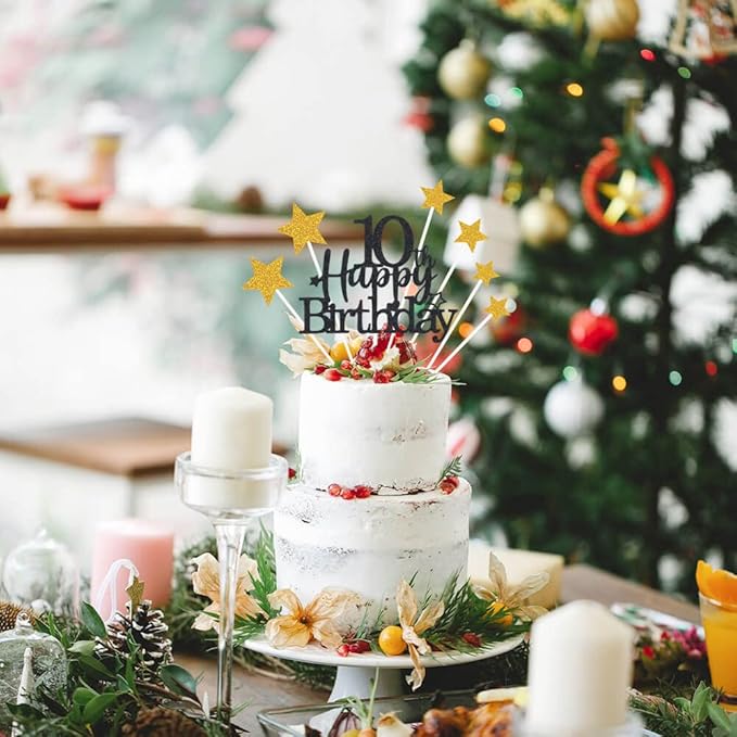 Glittery 10th Happy Birthday Cake Topper with Star,Personalised 10 Birthday Cake Toppers Party Decorations Party Supplies for Boys Girls Black Gold