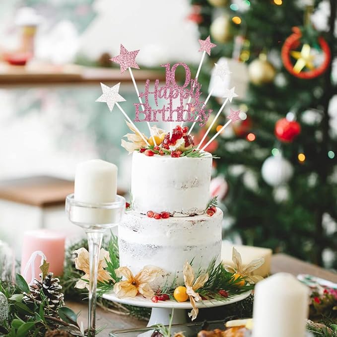Glittery 10th Happy Birthday Cake Topper with Star,Personalised 10 Birthday Cake Toppers Party Decorations Party Supplies for Boys Girls Rose Gold
