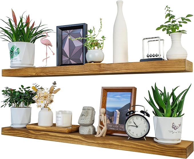 - Solid Wood Floating Shelves: The wood Floating Shelf is made from 100% solid pine, selected for its beautiful wood grain texture and knotted into points, with a sanded, hand-stained finish that gives the space a rustic, natural, warm feel. Note: All steps are done by hand and each ledge is slightly different, but equally stunning!