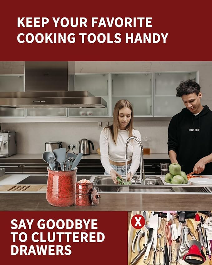 - Versatile and Stylish Addition: Elevate your kitchen decor with its elegant red design, adding a touch of retro style. Besides its primary use as a kitchen utensil organizer, it doubles as a wine cooler, makeup brush holder, flower vase, plant pot, or a captivating decorative piece