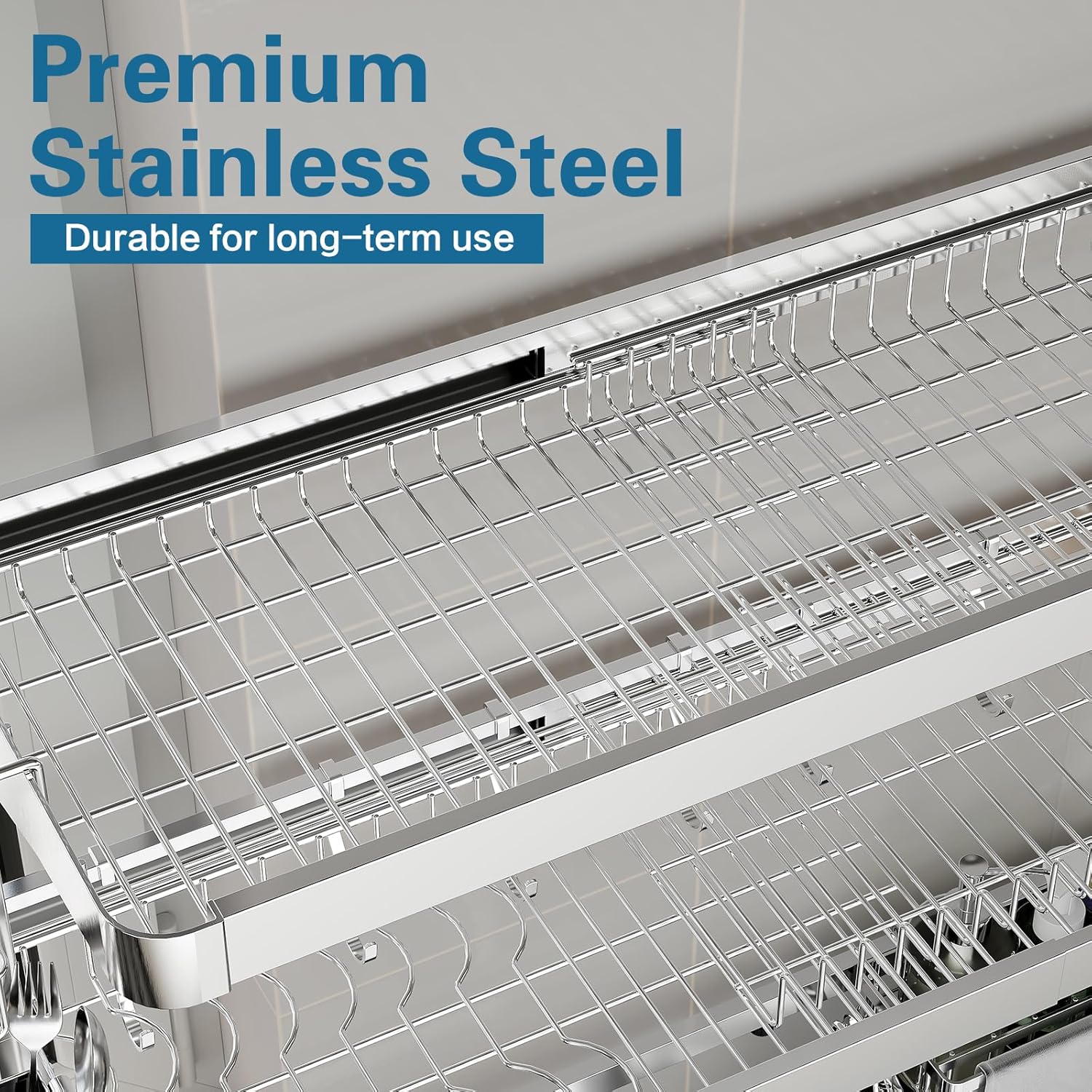- Full 304 Stainless Steel Over-Sink Dish Rack This high-grade 304 stainless steel offers excellent resistance to a wide range of atmospheric environments. Its durability ensures easy maintenance, making it ideal for kitchen and food-related applications. The product has passed a 24-hour salt spray test, so there’s no need to worry about safety or health issues. The heavy-duty stainless steel shelf can support up to 200 lbs, making this a genuine all-stainless steel over-sink dish drying rack.