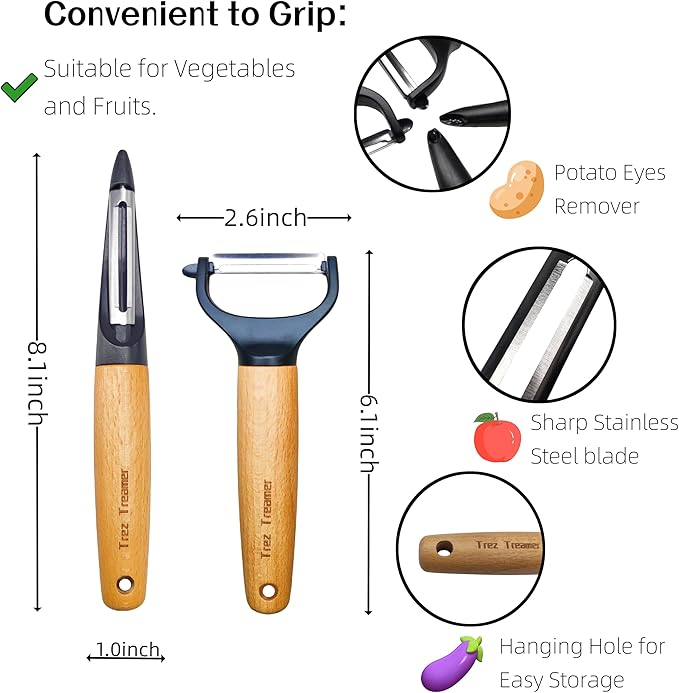 - 🍎【Sharp & Dishwasher Safe】: The wooden-handled potato peeler utilizes 420J2 martensitic stainless steel as dual-blades, renowned for its sharpness and longevity. Its dual-blade design resists rust effectively.It's safe for dishwasher cleaning.