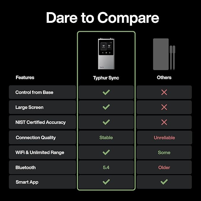 - 6 Sensors: With 5 optimally placed internal sensors and an ambient sensor on the tip, the Typhur Sync wireless meat thermometer can accurately measure doneness and even predict when your cook will be done with intelligent algorithm.