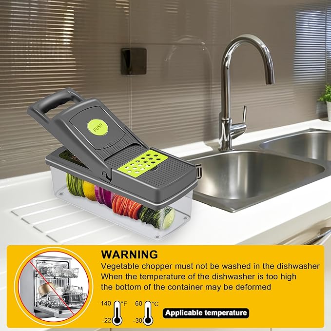 - 16 IN 1 VEGETABLE SLICER: 9 knives for dicer, slicer, grater, julienne, egg separator, and egg separator. Vegetable cutter with the perfect cutting function, easy cutting foods such as tomatoes, onions, potatoes, mushrooms, carrots, cucumbers, squash, etc