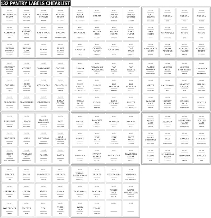 - 【PERFECT FOR PANTRY】132 Kitchen labels for containers to keep your food fresh and pantry tidy. Minimalist labels are black text on white food labels stickers suitable for all airtight storage containers. Pantry decal organization labels are preprinted on premium waterproof vinyl stickers that won't tear or peel off but can easily be removed.