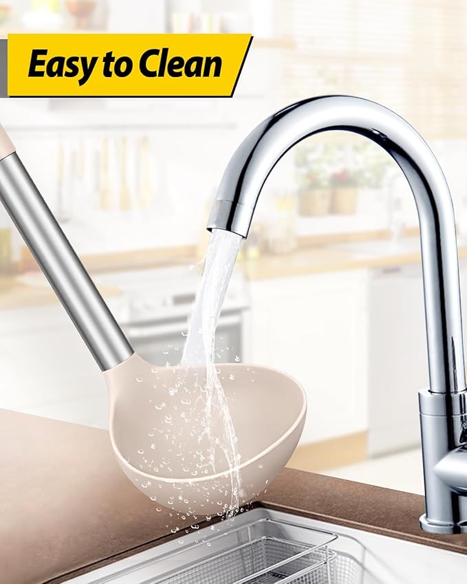 - More Safe and Healthy : Our kitchen ladle spoons are made of food-grade silicone, free of BPA;Even at high temperatures, there is no need to worry about melting or deforming;And the soft silicone head won't scratch the coating, it can better protect your pot
