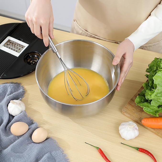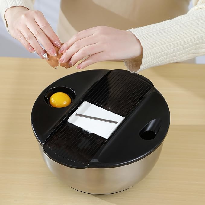 - Premium Quality:Stainless steel mixing bowls,Crafted from food-grade stainless steel,our mixing bowls are durable,non-toxic,and safe for food preparation.The high-quality material ensures long-lasting use,making it suitable for mixing salads,dough,baking,and food storage.The grater and slicer attachments in the lid are sharp and work well.
