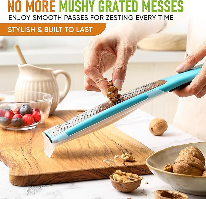 - Food Glides Easily On Surface - No more mushy grated messes. Enjoy smooth passes for zesting every time with this fruit zester. Easily zest citrus fruits like lemons, limes, and oranges. Also try it to grate cheese, parmesan, chocolate, ginger, garlic, nutmeg and more.
