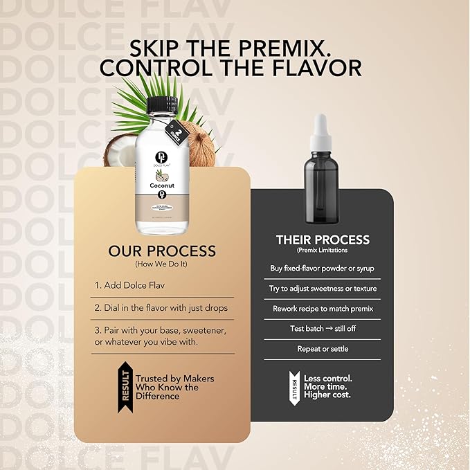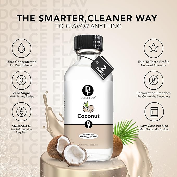 - Elevate Your Baking Adventure – Elevate your baking creations with Dolce Flav's water-based, unsweetened coconut extract flavoring. Infuse a touch of tropical paradise into your everyday recipes, transforming your culinary experience into something extraordinary.