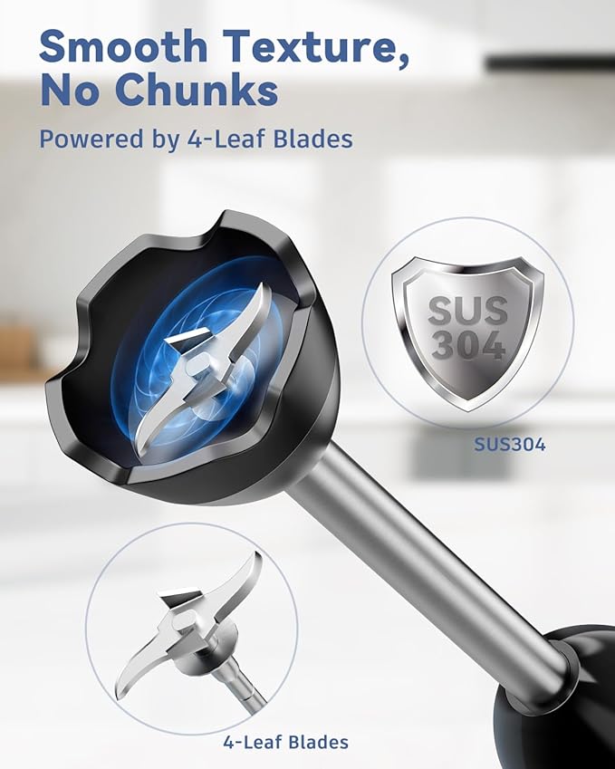 - HAND BLENDER SET: The 7-in-1 immersion blender handheld set comes with 2 blades (Stainless Steel 4-Leaf Blade and ice crusher blade) and features a unique bell guard that safeguards non-stick cookware from scratches, reduces suction, and prevents food splatters. The emulsions blender also includes a 500ml chopper, 20oz measuring cup, whisk, milk frother, accessories holder, and a 5 ft. power cord