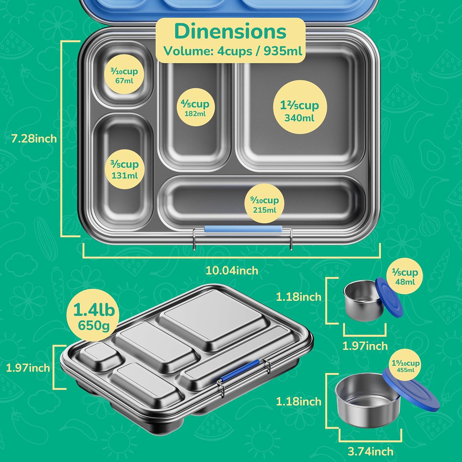 - Versatile & Spacious Design: With 33OZ/ 4 cups, 10.04×7.28×1.97in, capacity, and 5 compartments, Weight: 1.4 lb, this bento box accommodates a variety of meals, from salads to sandwiches, keeping them perfectly separated.