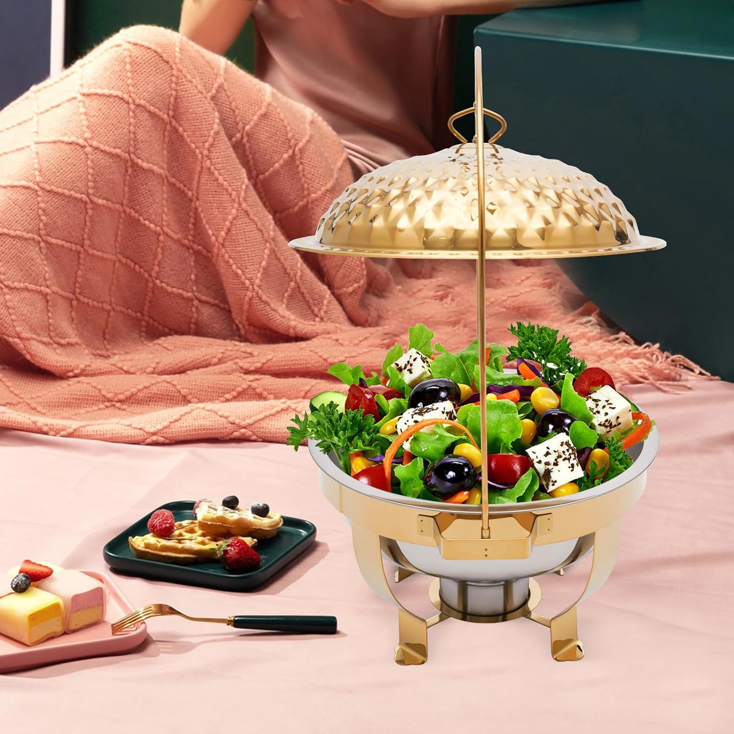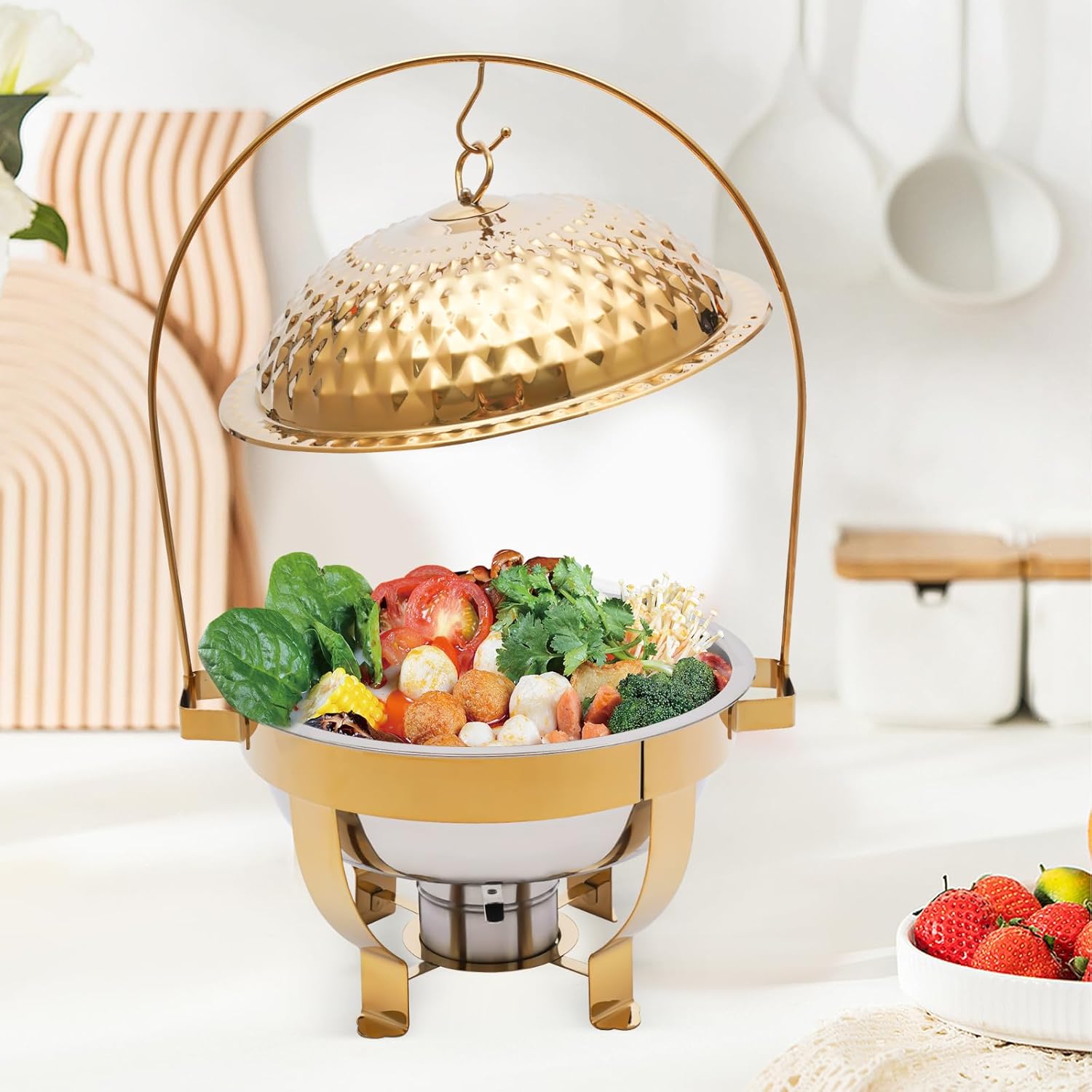 Chafing Dish Buffet Set Silver Accent, 4.5L Round Stainless Steel Chafer, Upgraded Buffet Servers and Warmers Set Warming Tray for Wedding, Parties, Banquet and Events (Gold)
