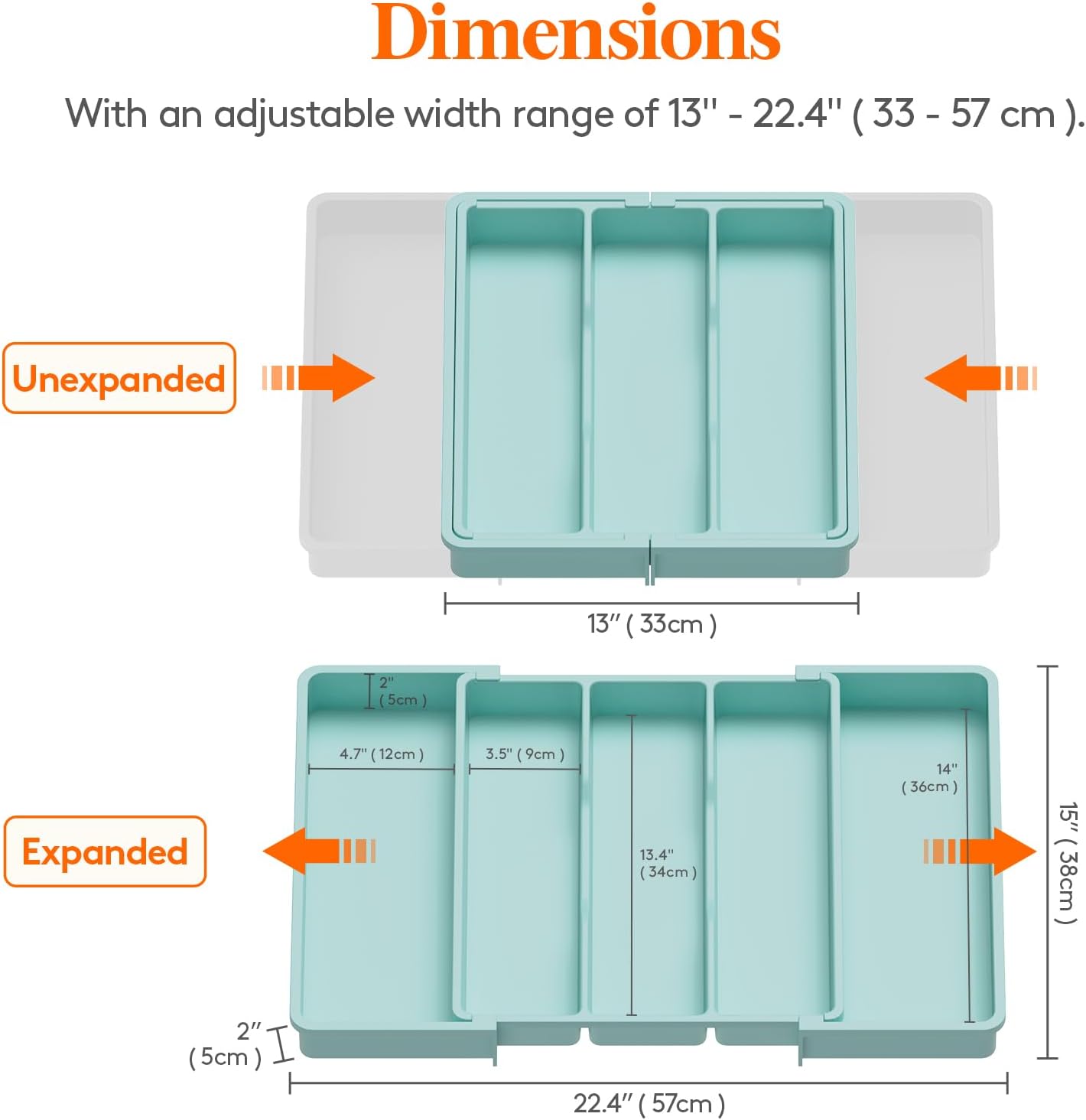 - Expandable and Adjustable: The utensil organizer for kitchen drawers can be expanded from 3 slots to 5 slots, offering extra storage space for utensils. It is adjustable to fit different drawer sizes, ranging from 13 to 22.4 inches wide. When folded, it measures 13" x 15" x 2", but expands to 22.4" x 15" x 2" for added space.